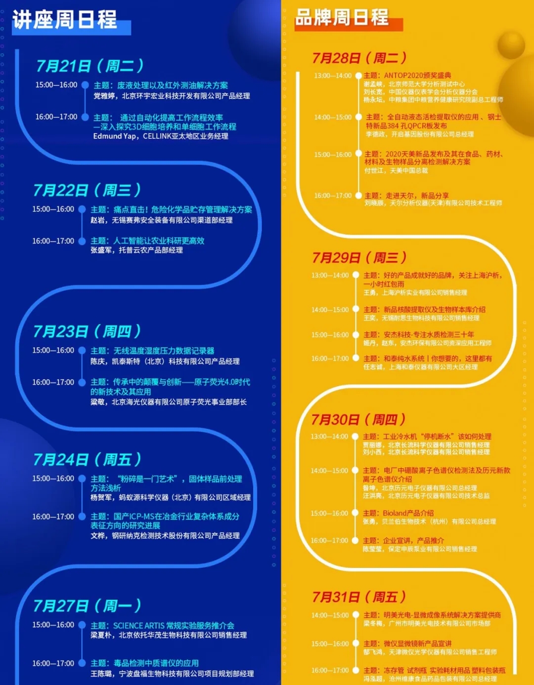 “線上直播”部分,7月21日-31日將有26場次的線上直播,包含了“講座周”、“品牌周”兩大板塊?!爸v座周”以傳播普及先進技術和經驗為主要內容,“品牌周”以產品推介為主要內容。歡迎科學儀器行業從業者于7月20-31日期間,參觀“CISILE線上展覽”,觀看線上直播。