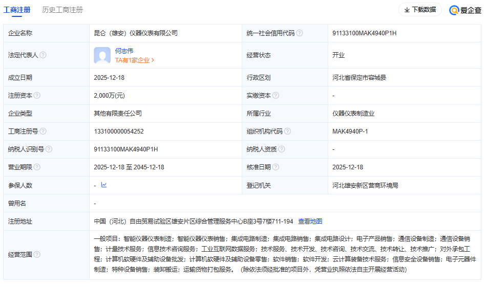 近日,昆侖(雄安)儀器儀表有限公司成立,法定代表人為何志偉,注冊資本2000萬元人民幣,經(jīng)營范圍涵蓋智能儀器儀表制造與銷售、集成電路設(shè)計與制造、通信設(shè)備制造、計量技術(shù)服務(wù)等高新技術(shù)領(lǐng)域。
