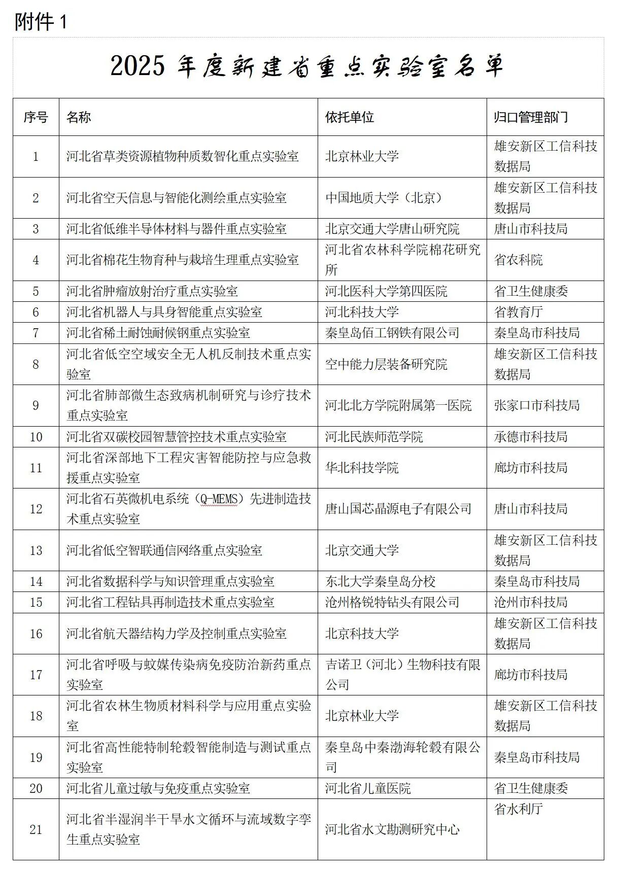 河北省科學技術廳關于公布2025年新建省重點實驗室和省技術創新中心名單的通知