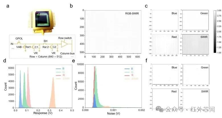 所提出的直接光圖案化方法與標準CMOS制造工藝完全兼容。研究人員將基于聚合物的三色可見光像素與基于碲化汞量子點的短波紅外像素單片集成到同一讀出電路上。這種混合集成策略使得四通道成像器件得以實現,其中可見光和短波紅外像素以2×2陣列排列,每個子陣列的有效分辨率為320×256。